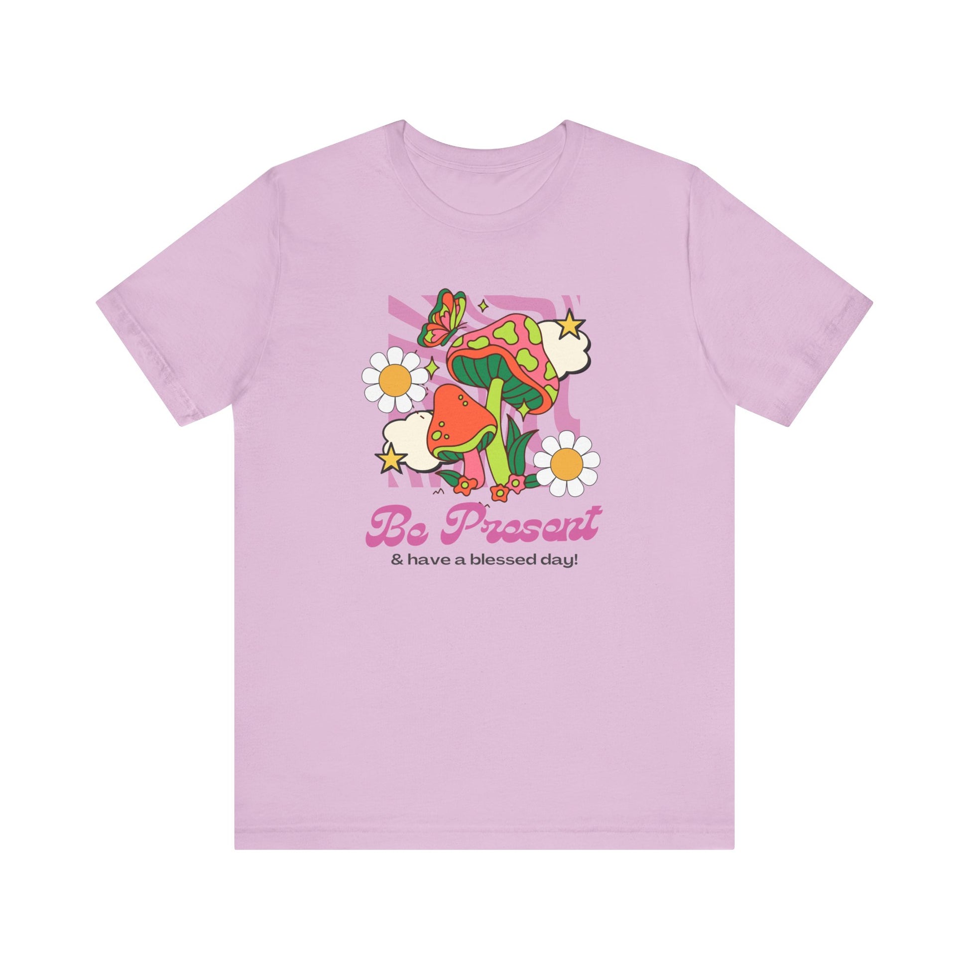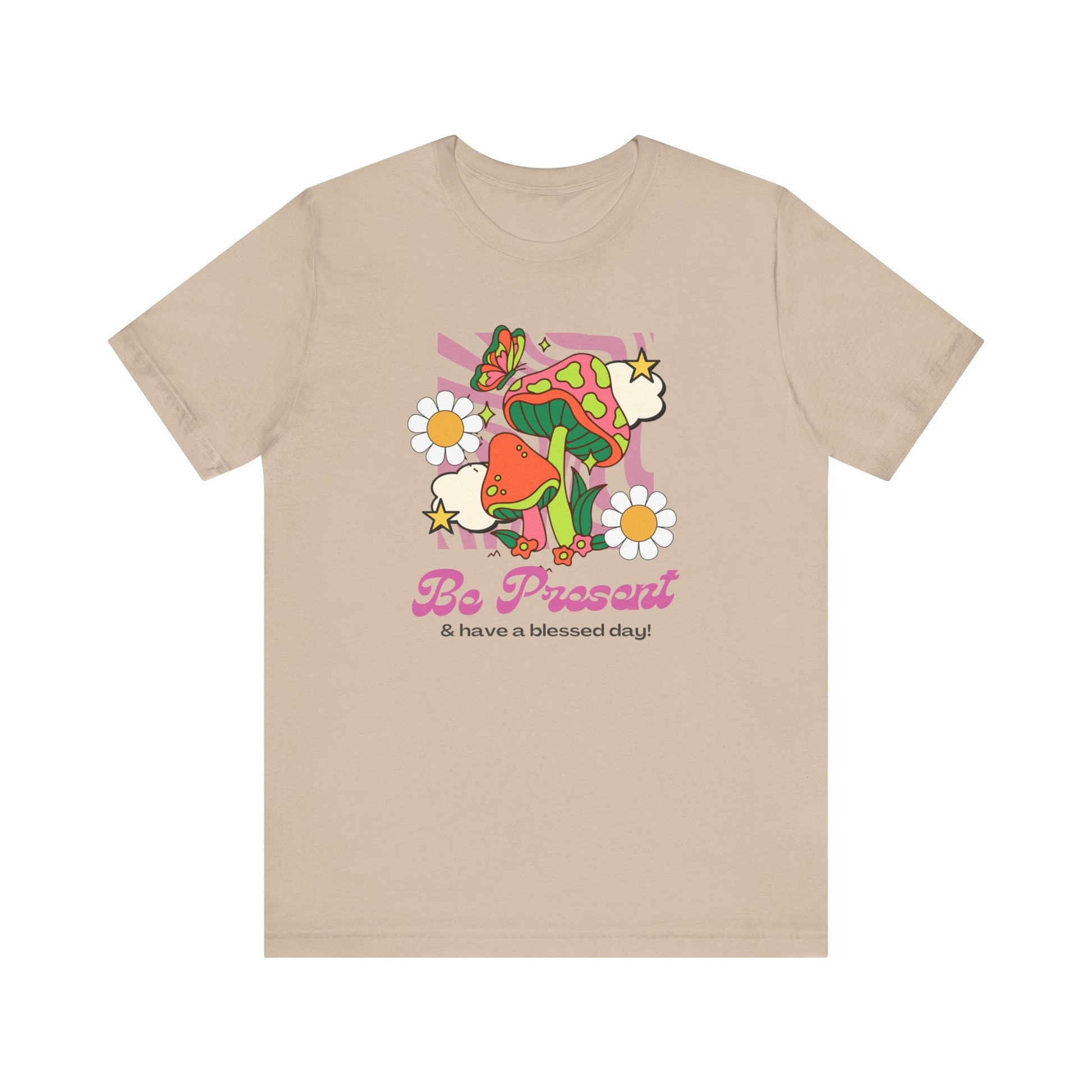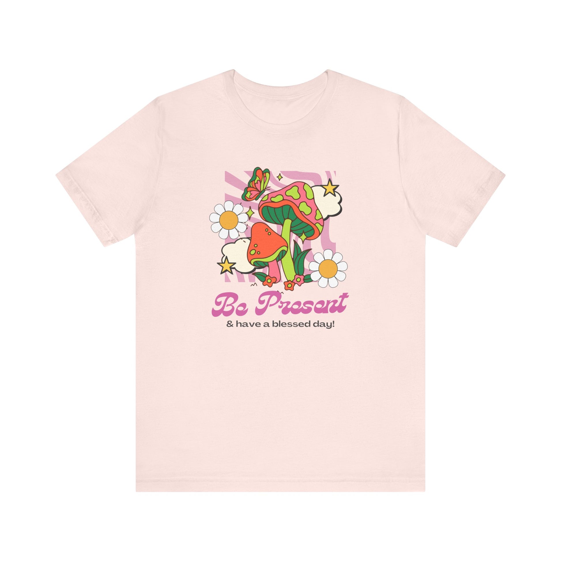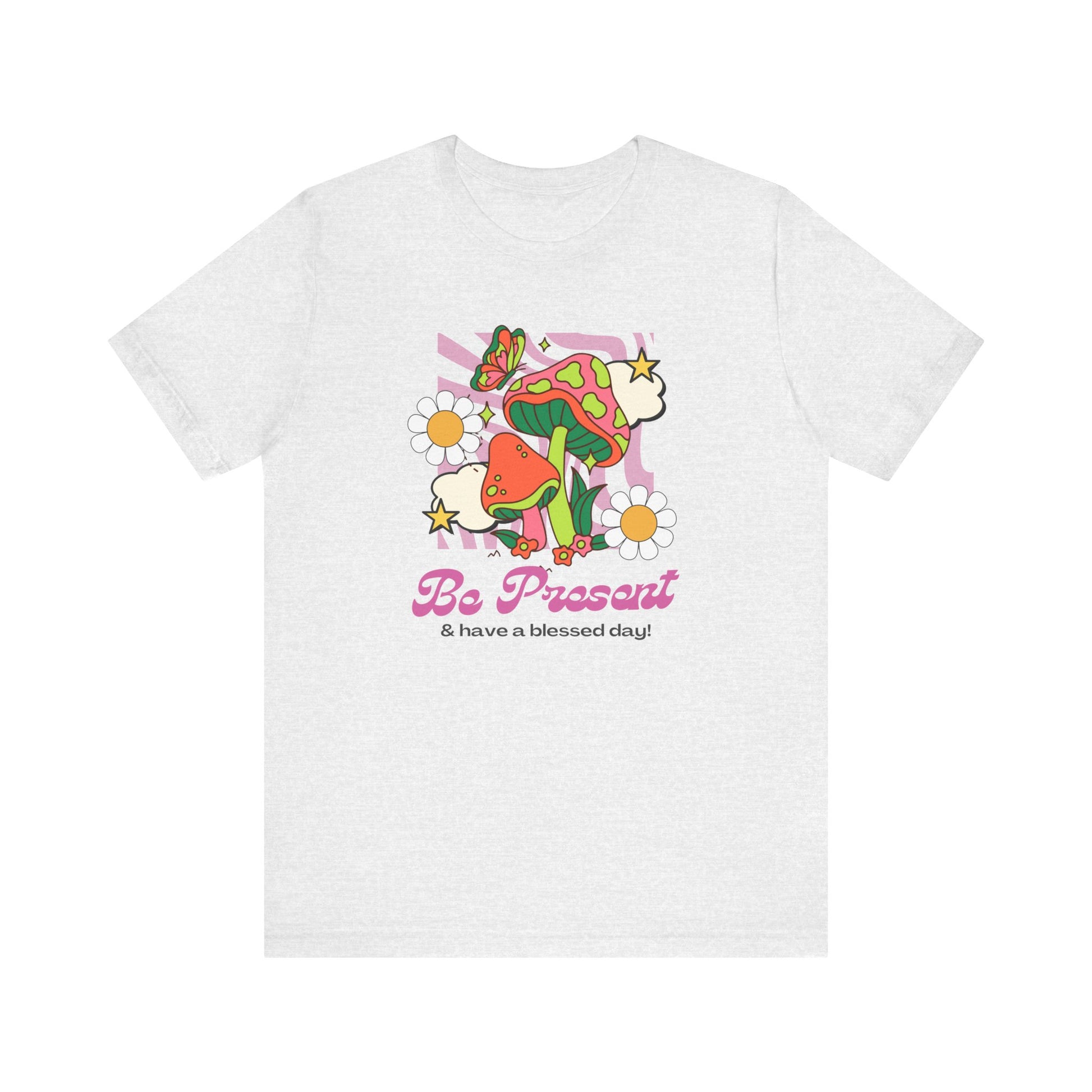Brighten your day (and everyone else’s) with our Be Present T-shirt! Featuring a whimsical design of colorful mushrooms, cheerful daisies, and playful stars, this tee reminds you to stay in the moment and enjoy the little things. With its vibrant colors and uplifting message—“Be Present & Have a Blessed Day!”—it’s the perfect blend of positivity and style. 🌈💖