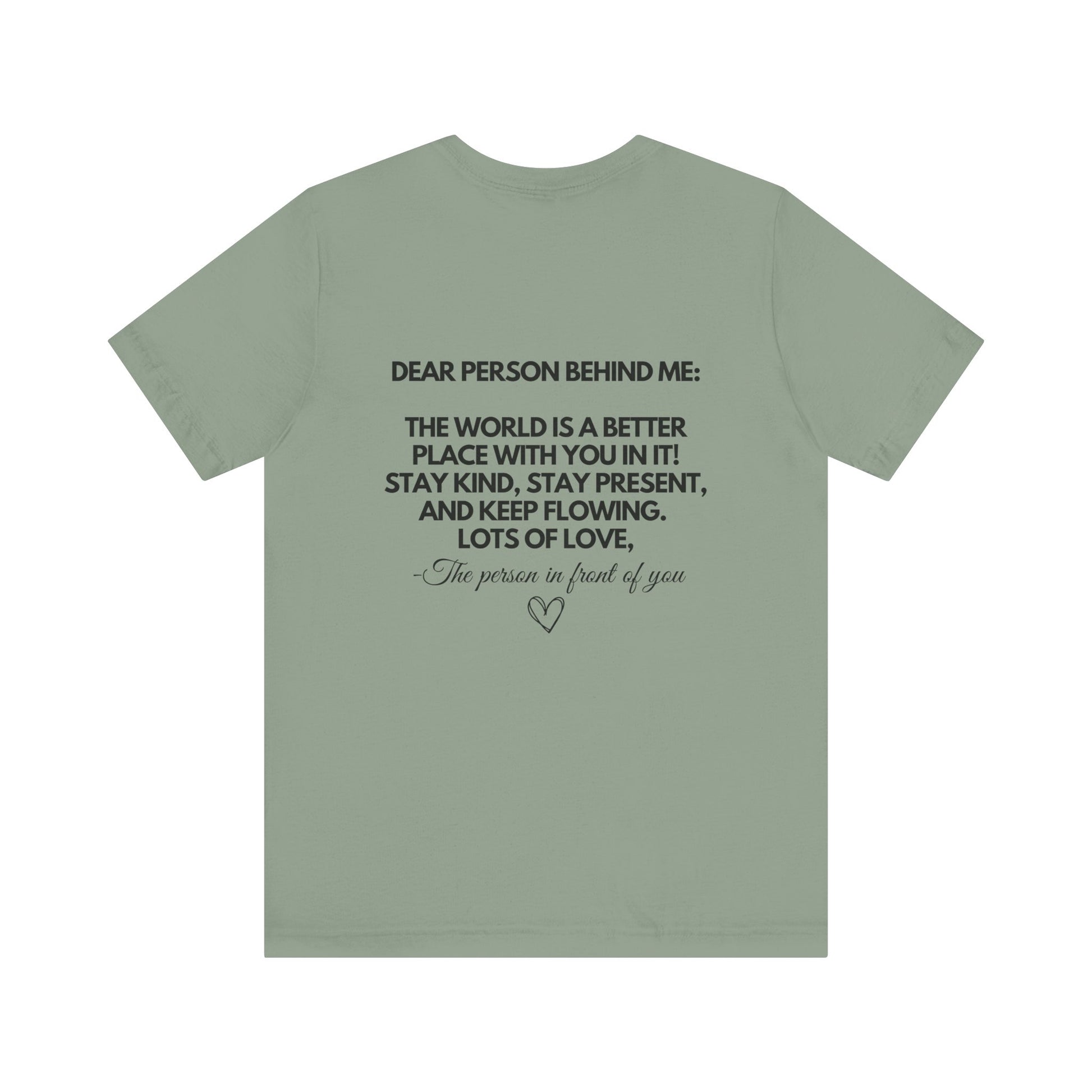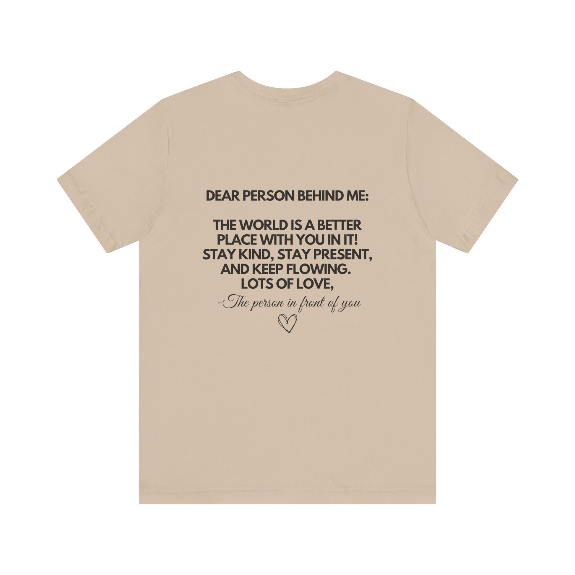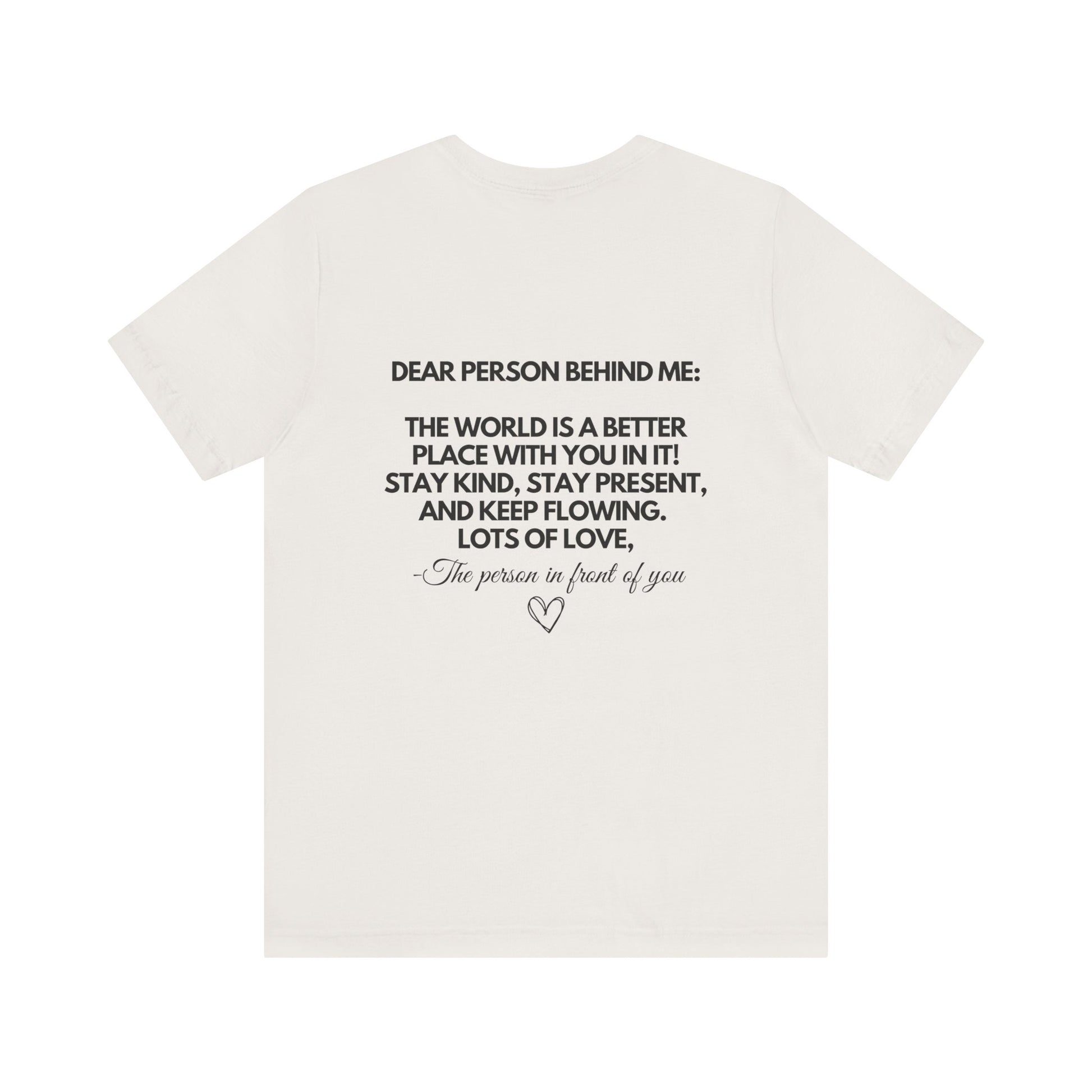 Sometimes, the simplest words make the biggest impact. Our Dear Person Behind Me T-shirt delivers a heartfelt message to anyone who crosses your path: “The world is a better place with you in it!” Lightweight, comfortable, and packed with positivity, this tee is your go-to for spreading love and good vibes everywhere you go. 🌟