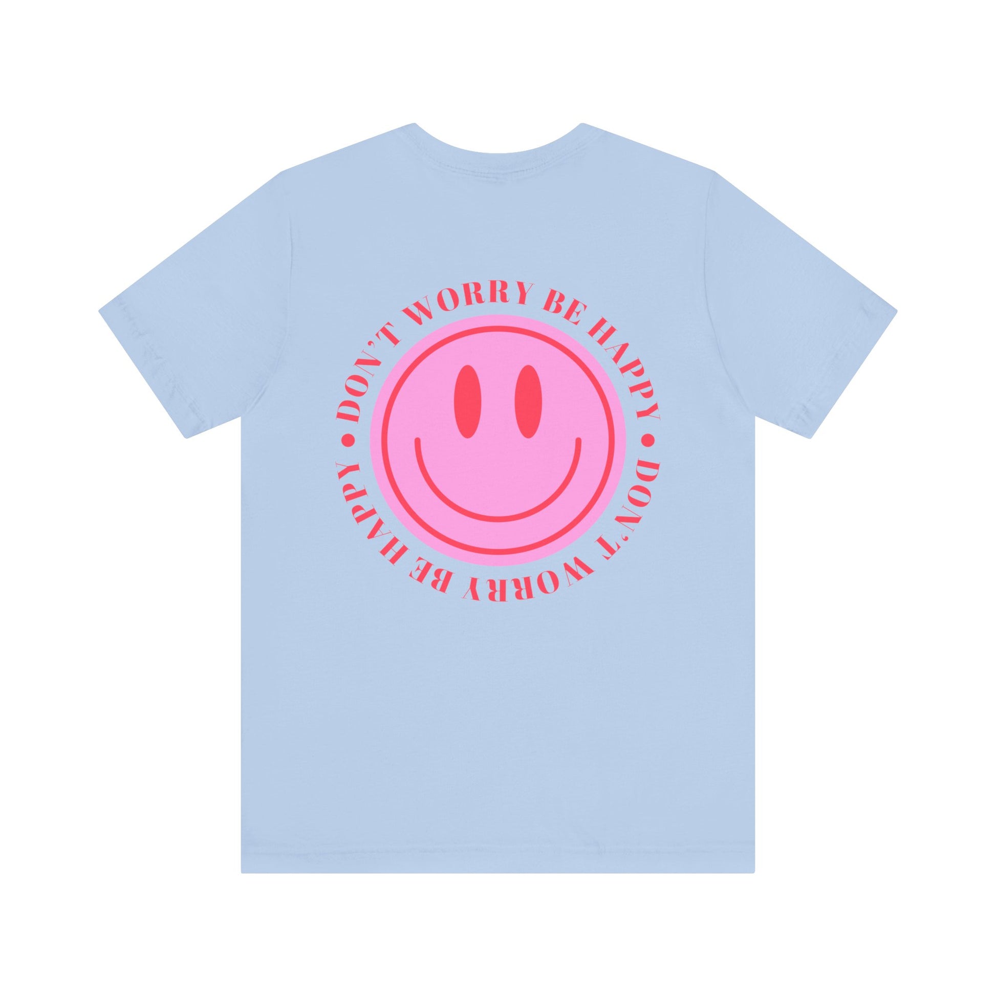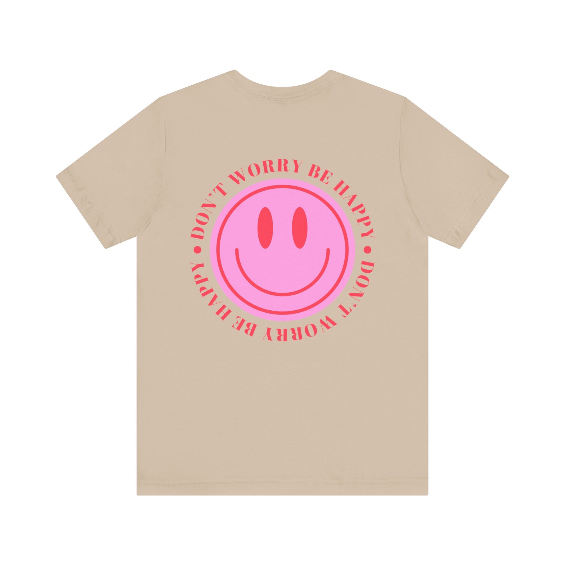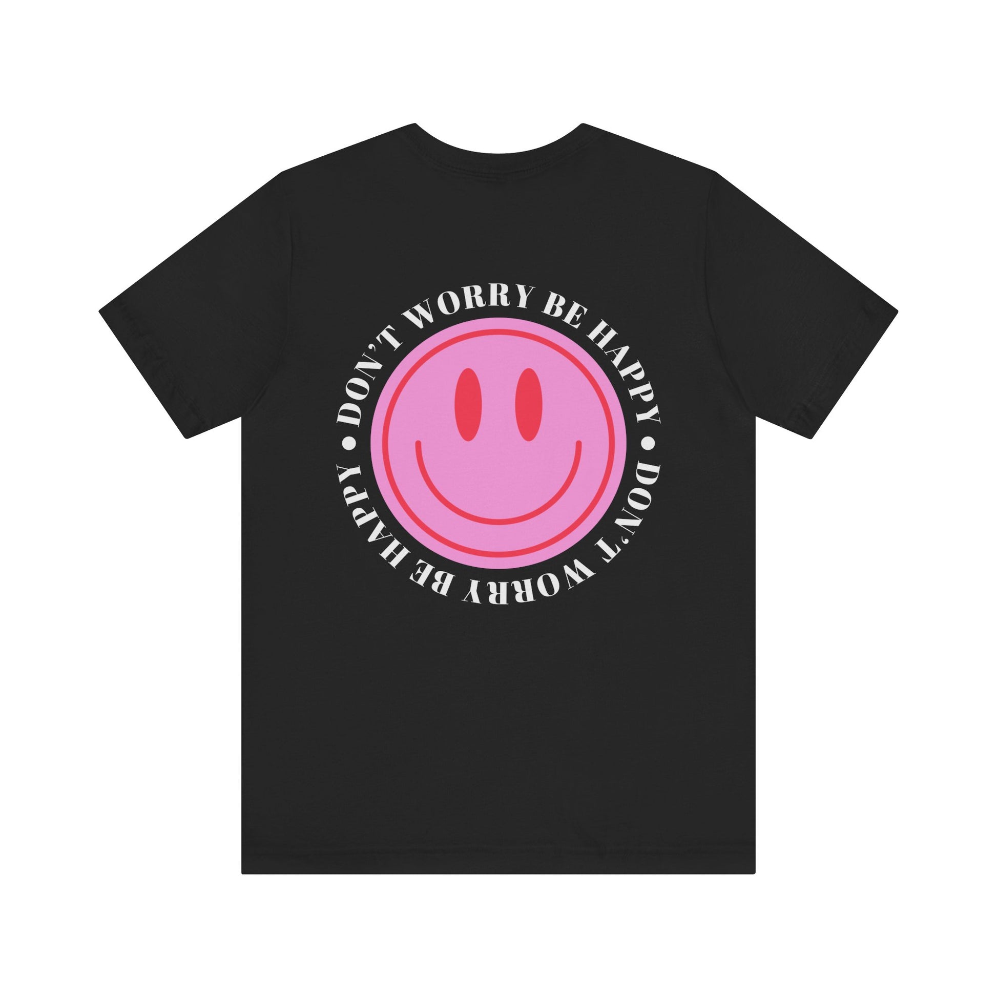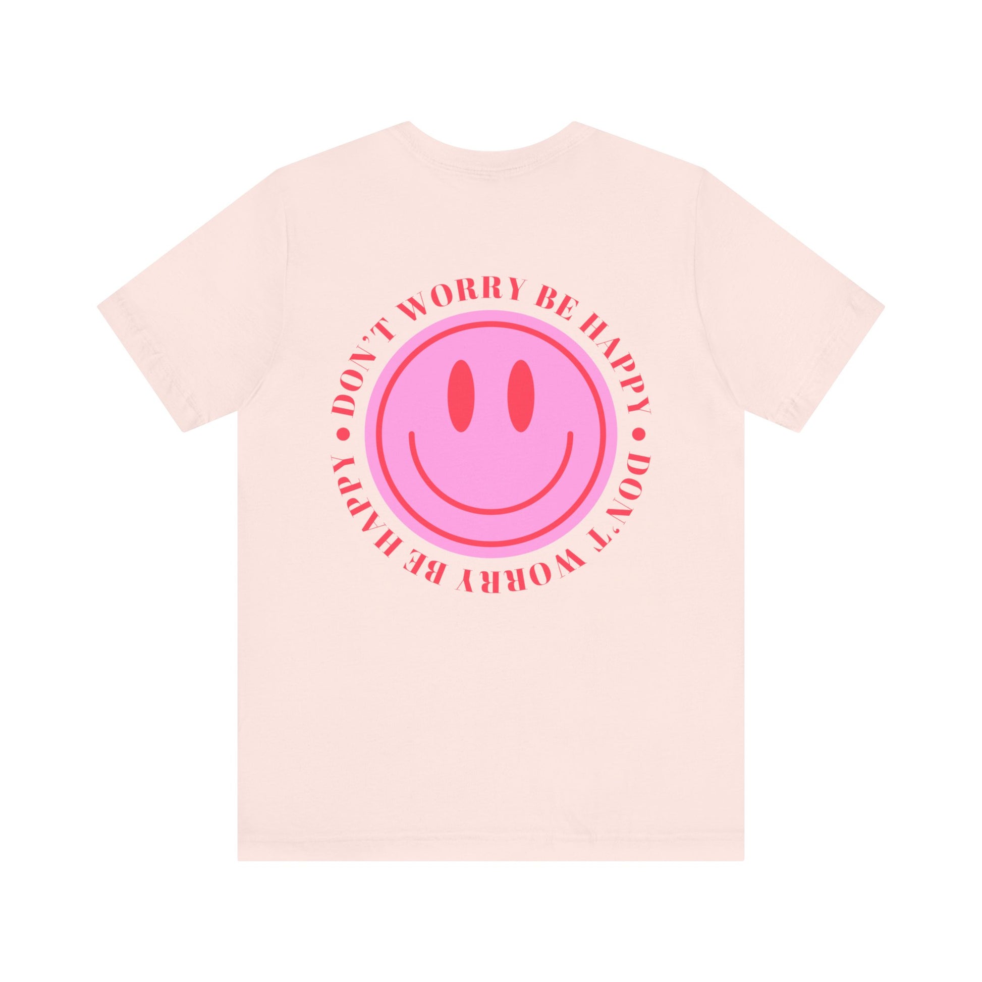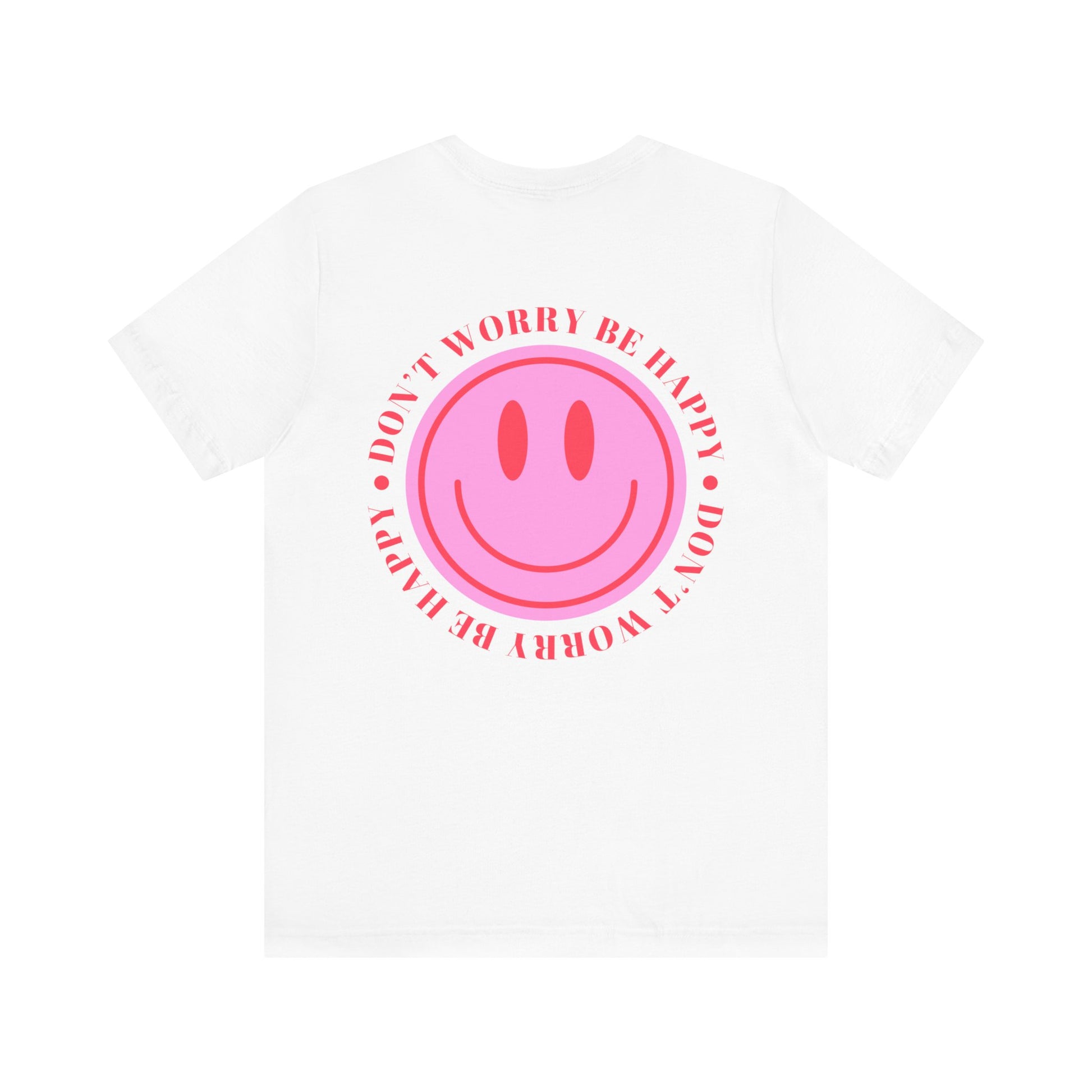 Keep it casual, comfy, and cheerful with our Don’t Worry Be Happy t-shirt. Featuring a bold pink smiley face on the back with the uplifting mantra “Don’t Worry Be Happy” encircling the design, this tee is perfect for spreading good vibes wherever you go. With a smaller smiley detail on the front, this lightweight t-shirt strikes the perfect balance between playful and stylish.
