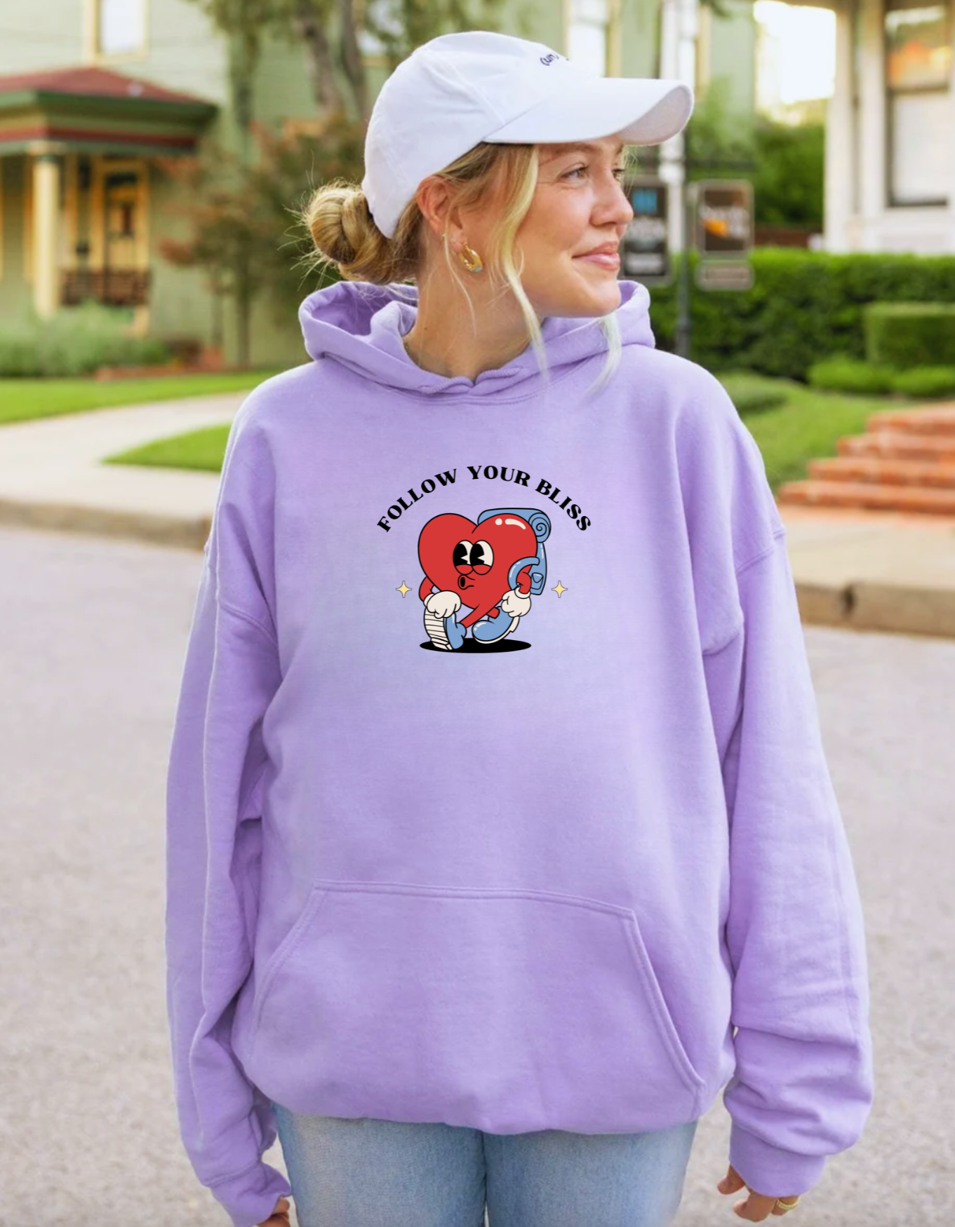 ❤️ Chase your dreams in comfort and style with our ‘Follow Your Bliss’ hoodie! Featuring a quirky cartoon heart grooving with headphones and sipping coffee, this playful design is paired with the uplifting message "Follow Your Bliss." It’s perfect for cozy days, casual outings, or simply sharing good vibes with the world.