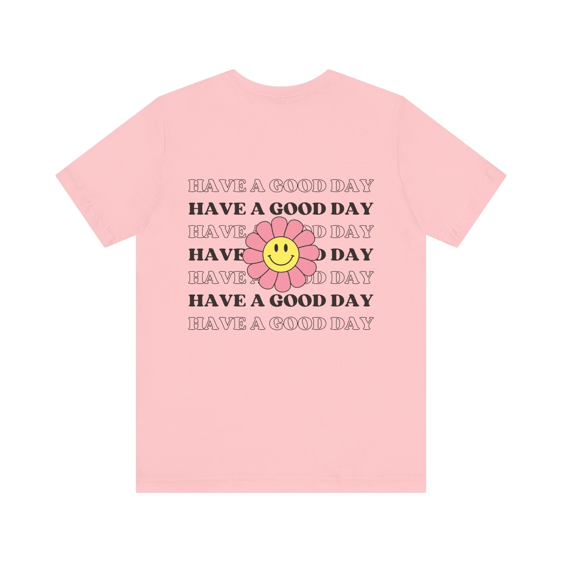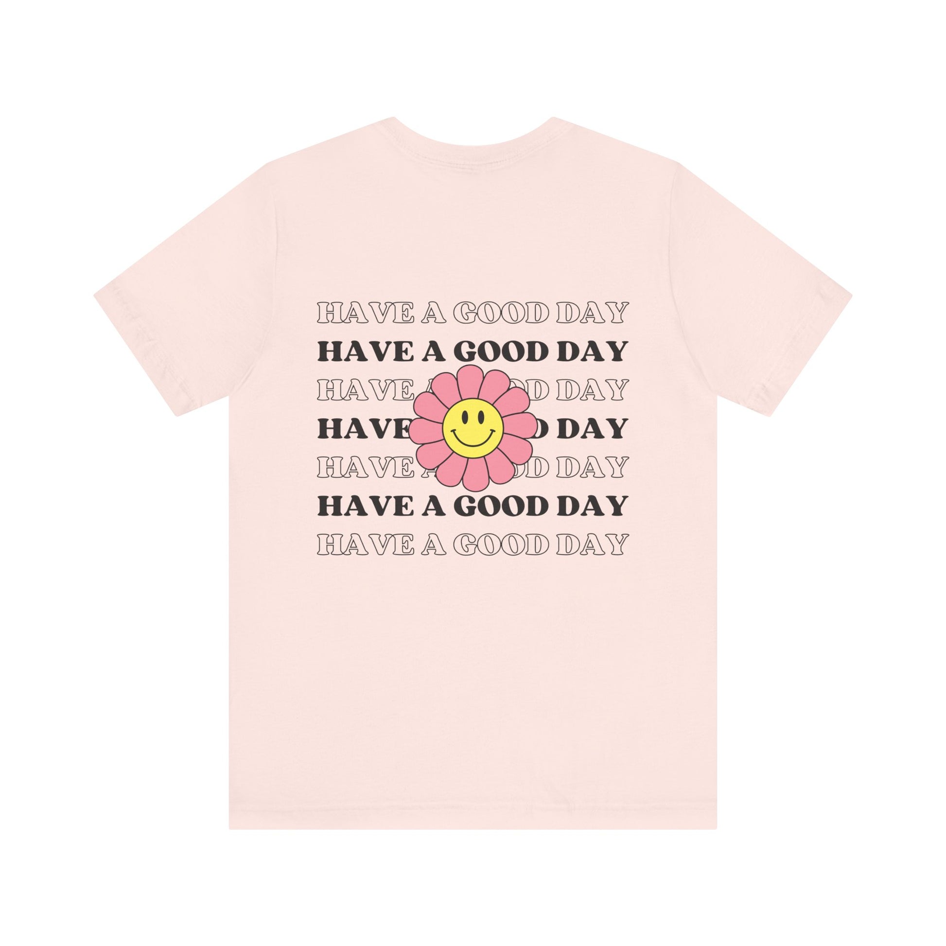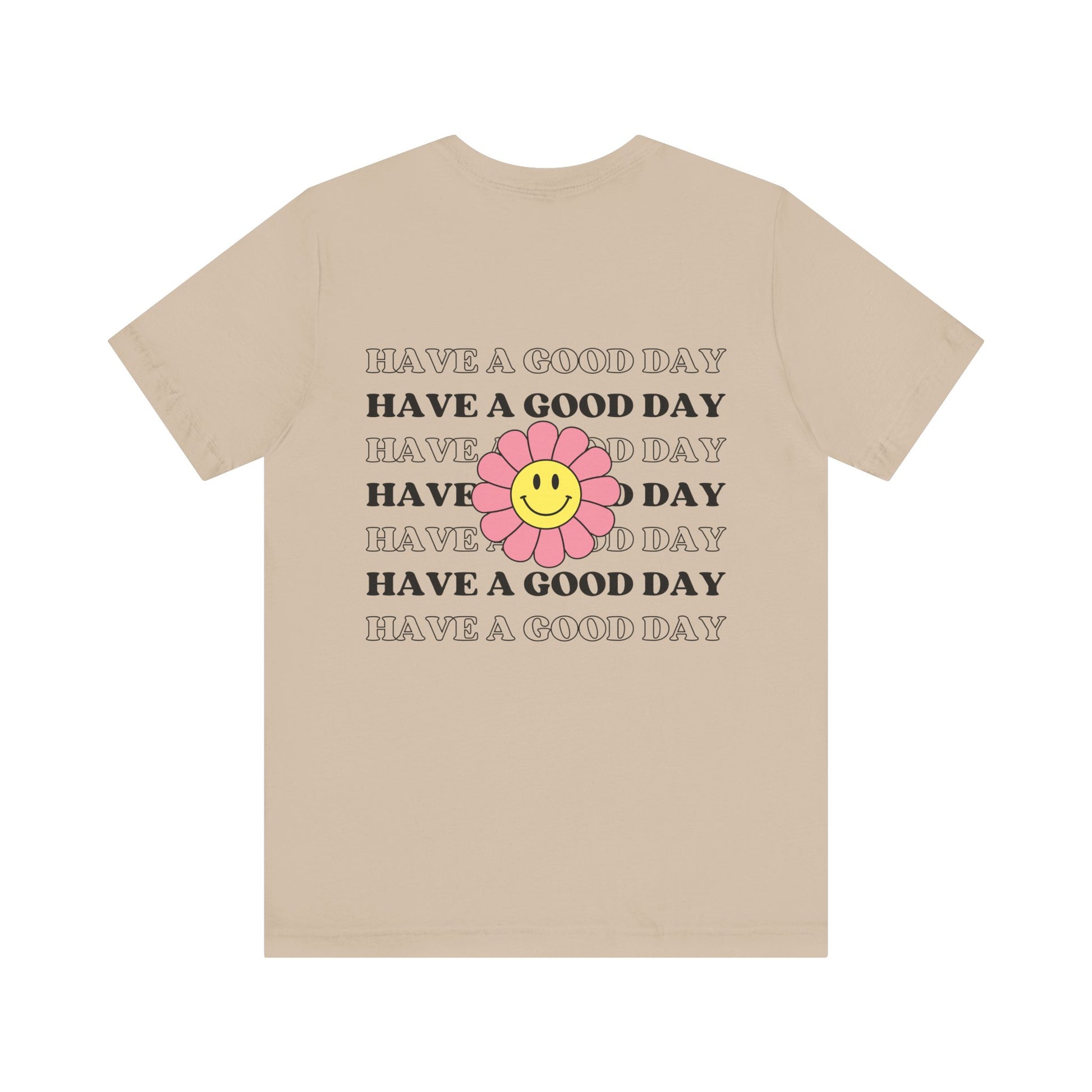 🌼✨ Bring some sunshine to your wardrobe with our "Have a Good Day" t-shirt! Featuring a retro-inspired design with a playful pink daisy and a cheerful smiley face surrounded by repeating "Have a Good Day" text, this tee is all about spreading positivity and good vibes wherever you go.