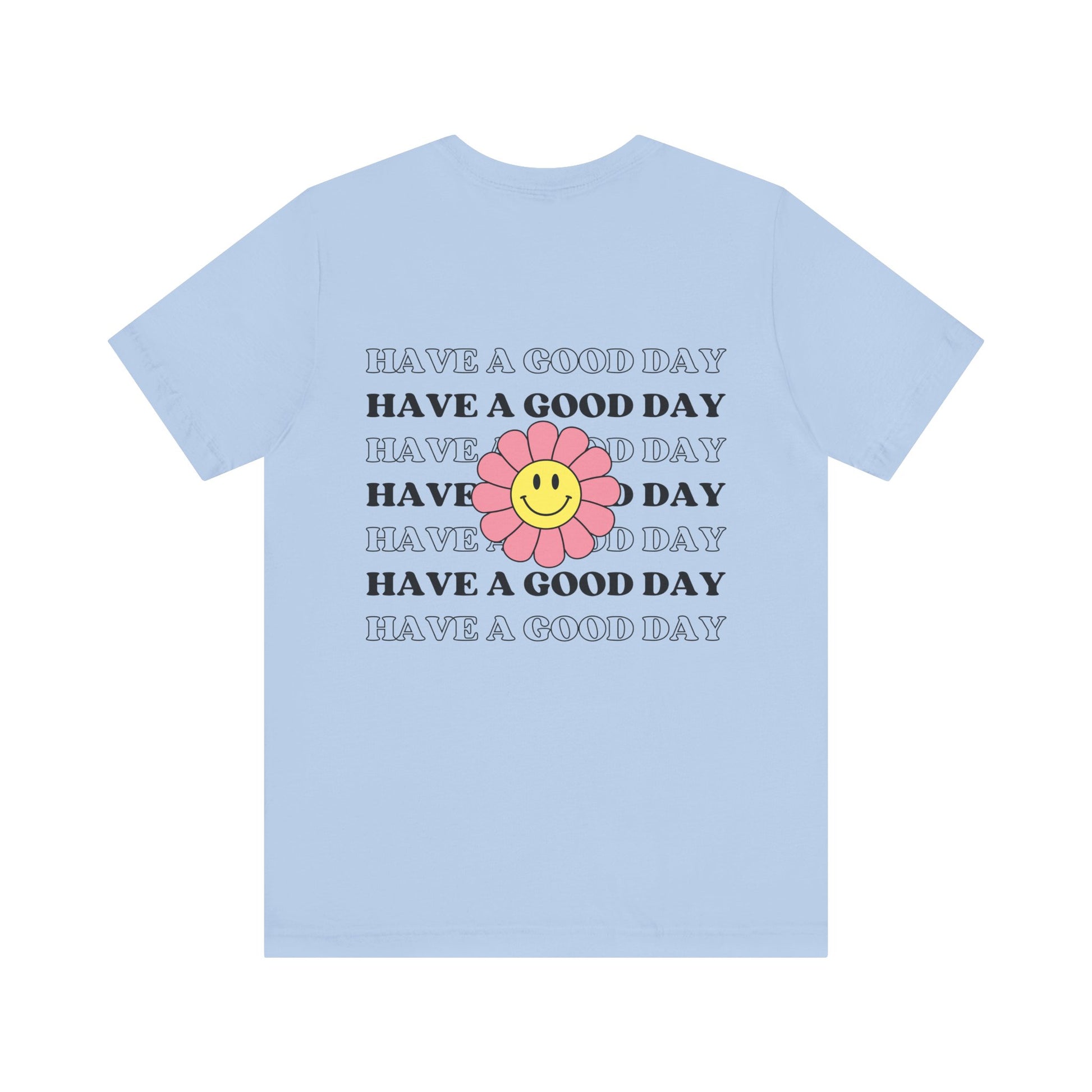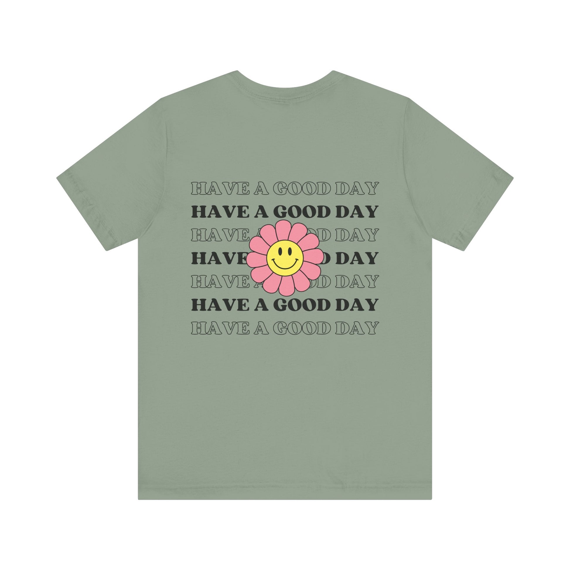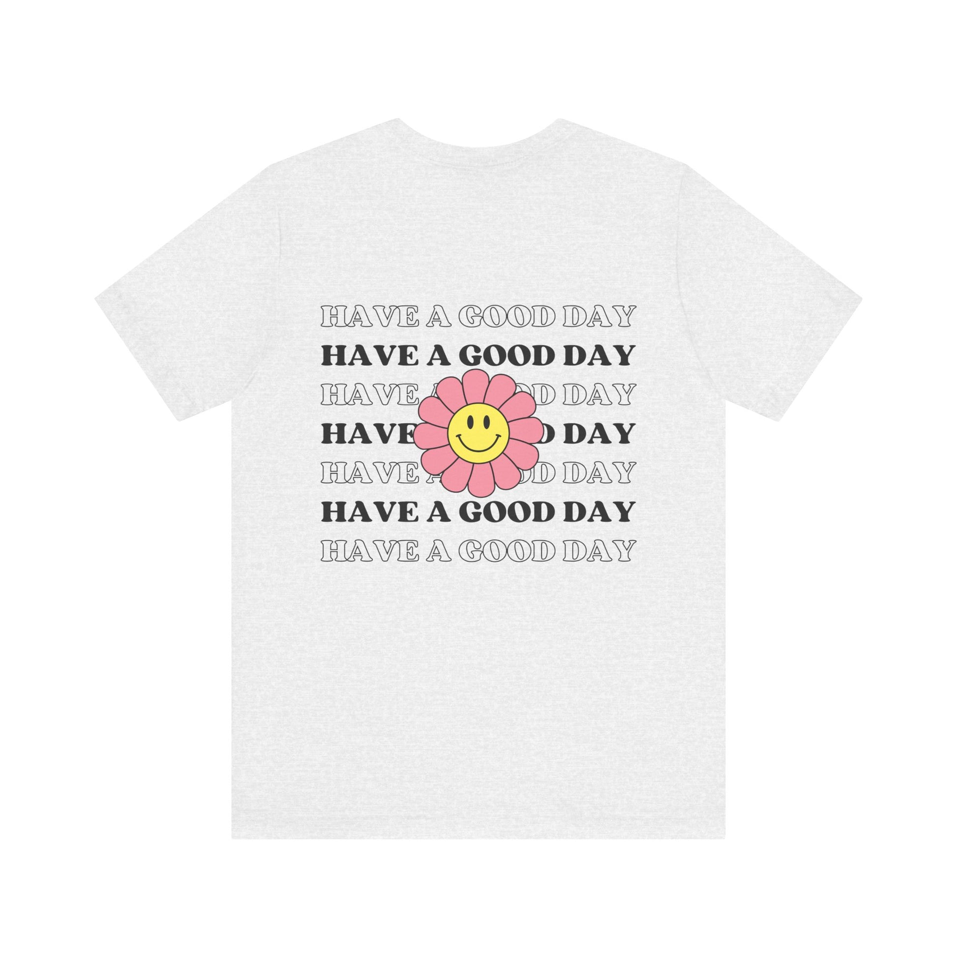 🌼✨ Bring some sunshine to your wardrobe with our "Have a Good Day" t-shirt! Featuring a retro-inspired design with a playful pink daisy and a cheerful smiley face surrounded by repeating "Have a Good Day" text, this tee is all about spreading positivity and good vibes wherever you go.