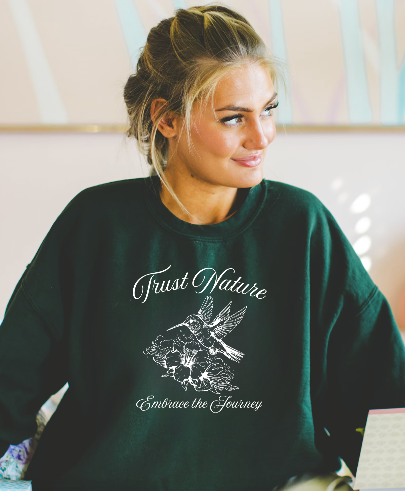 Reconnect with nature and your inner peace in our Trust Nature crewneck sweatshirt. Featuring an elegant hummingbird and floral design paired with the inspiring message "Embrace the Journey," this sweatshirt is a wearable reminder to trust life’s natural flow. Cozy, stylish, and timeless—this is your new favorite sweatshirt for all seasons. 🌸🐦