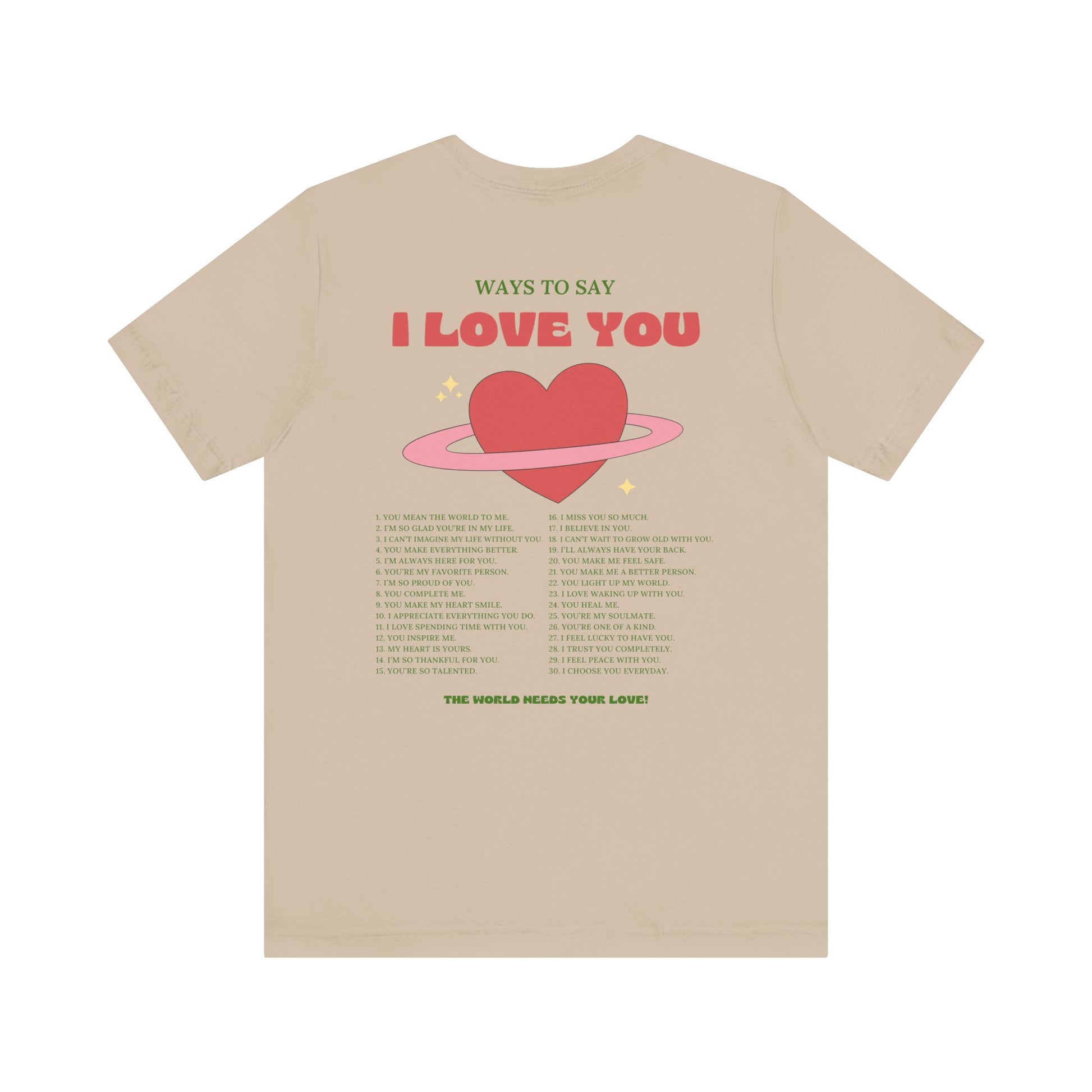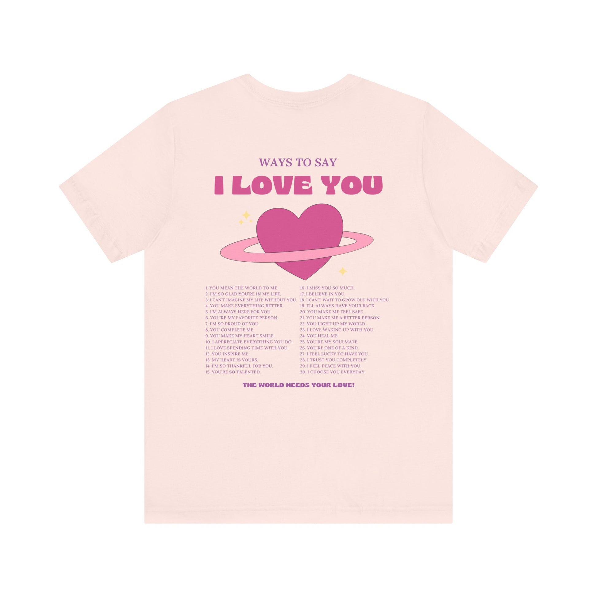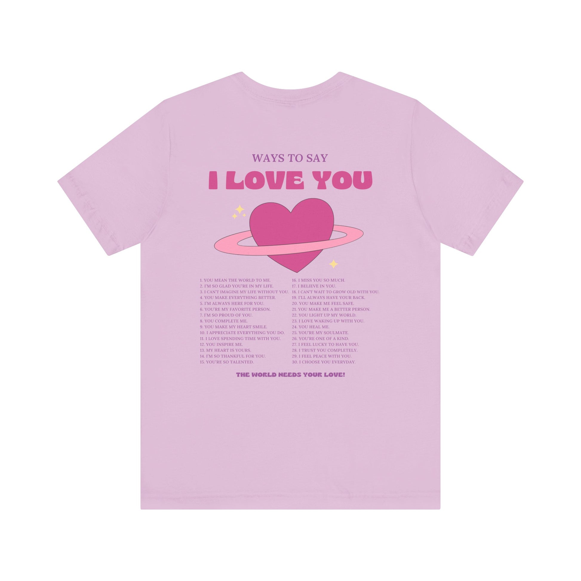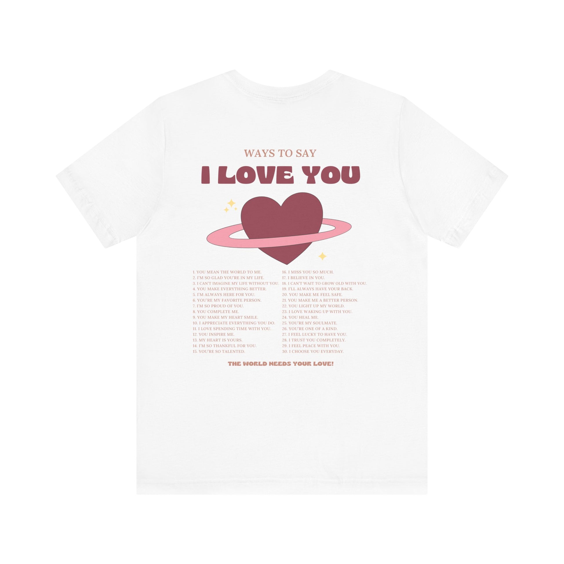 💖 Share the love in style with our ‘Ways to Say I Love You’ t-shirt! Featuring a minimalist "I LOVE YOU" text on the front and a vibrant, heartwarming list of ways to say “I love you” on the back, this tee is the perfect mix of simplicity and sentiment. Complete with playful pink and red tones and a bold heart design, it’s the ideal t-shirt for romantics, positivity lovers, or anyone who wants to wear their heart on their sleeve – or back!